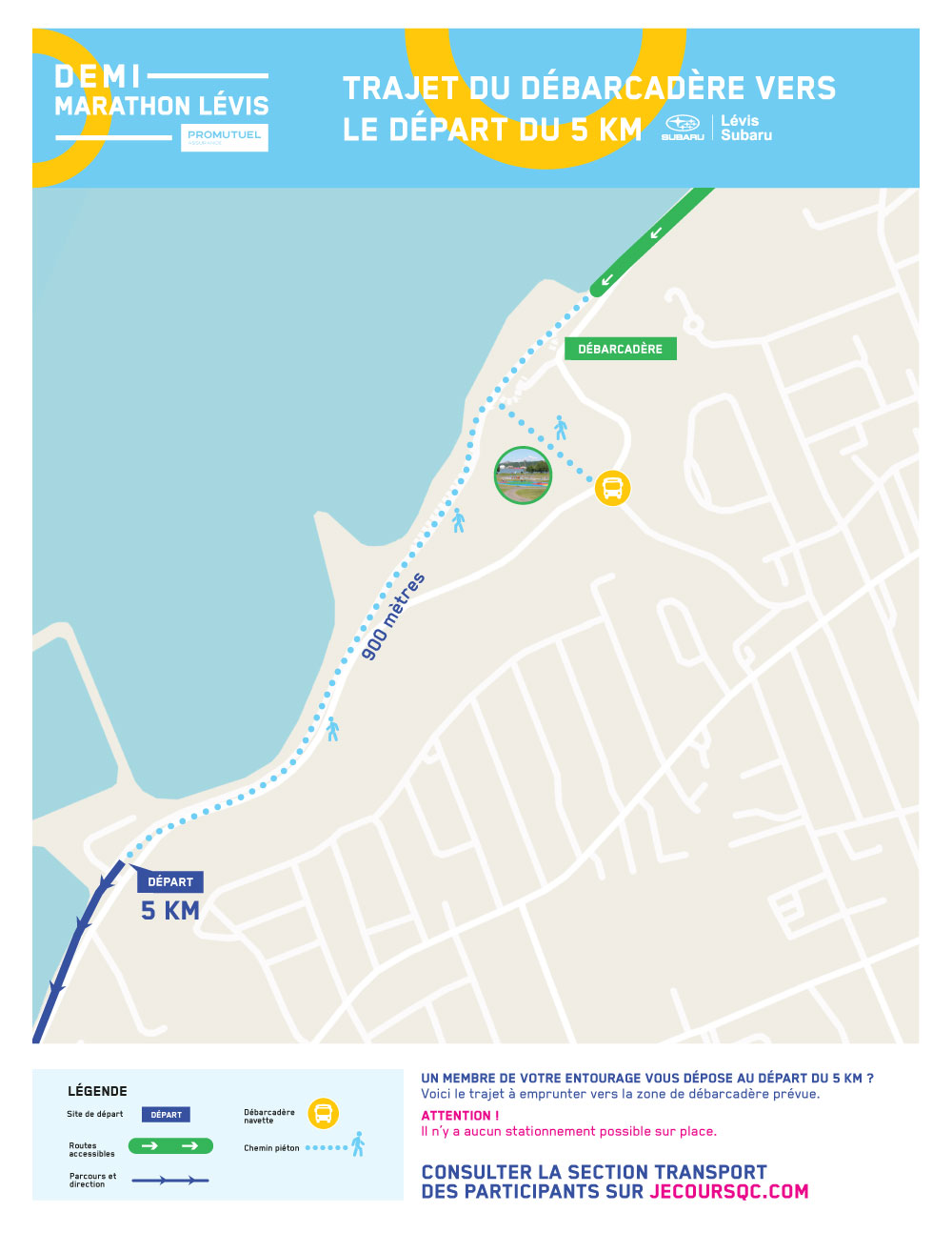 Shuttles will transport participants free of charge between 7:00 a.m. and 8:00 a.m. to their respective departure site, from the shuttle site, located on 2nd Street in Saint-Romuald, between 1st and 2nd Avenue. See the map below to get to the shuttle site.